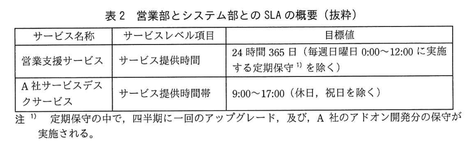 A社と営業部の間では、【表2】にあるとおり「営業支援サービス」についてSLAを結び、システム部がサービス提供の責任主体です。