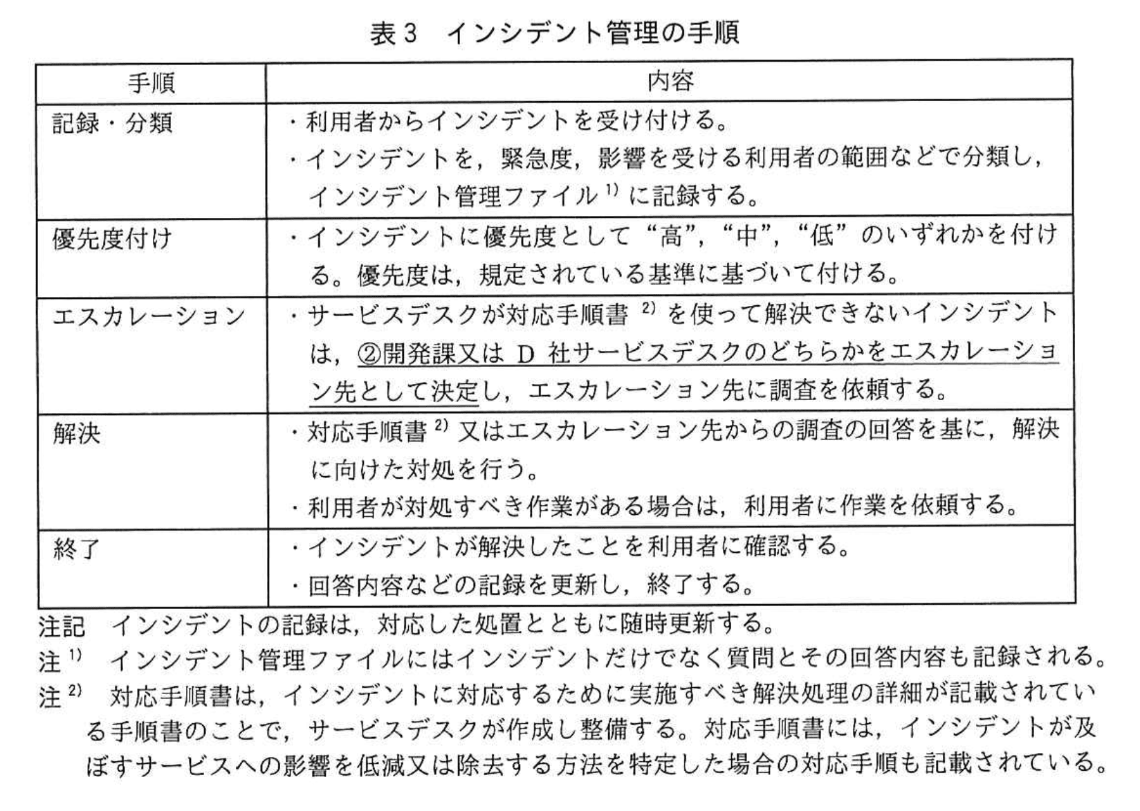 引用:【表3】エスカレーション「②開発課又はD社サービスデスクのどちらかをエスカレーション先として決定し…」 -