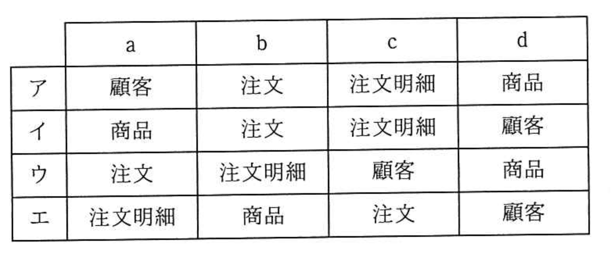 - エ:注文明細がaにあり、商品がbにあるが、顧客と注文の関係が不明瞭で誤り。