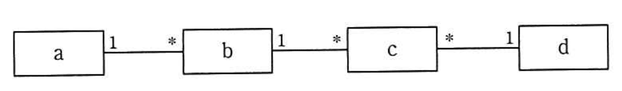 商品の注文を記録するクラス (顧客、商品、注文、注文明細)の構造を概念データモデルで表現する。a〜d に入れるべきクラス名の組合せはどれか。ここで、顧客は何度も注文を行い、一度に一つ以上の商品を注文でき、注文明細はそれぞれ1種類の商品に対応している。また、モデルの表記には UMLを用いる。