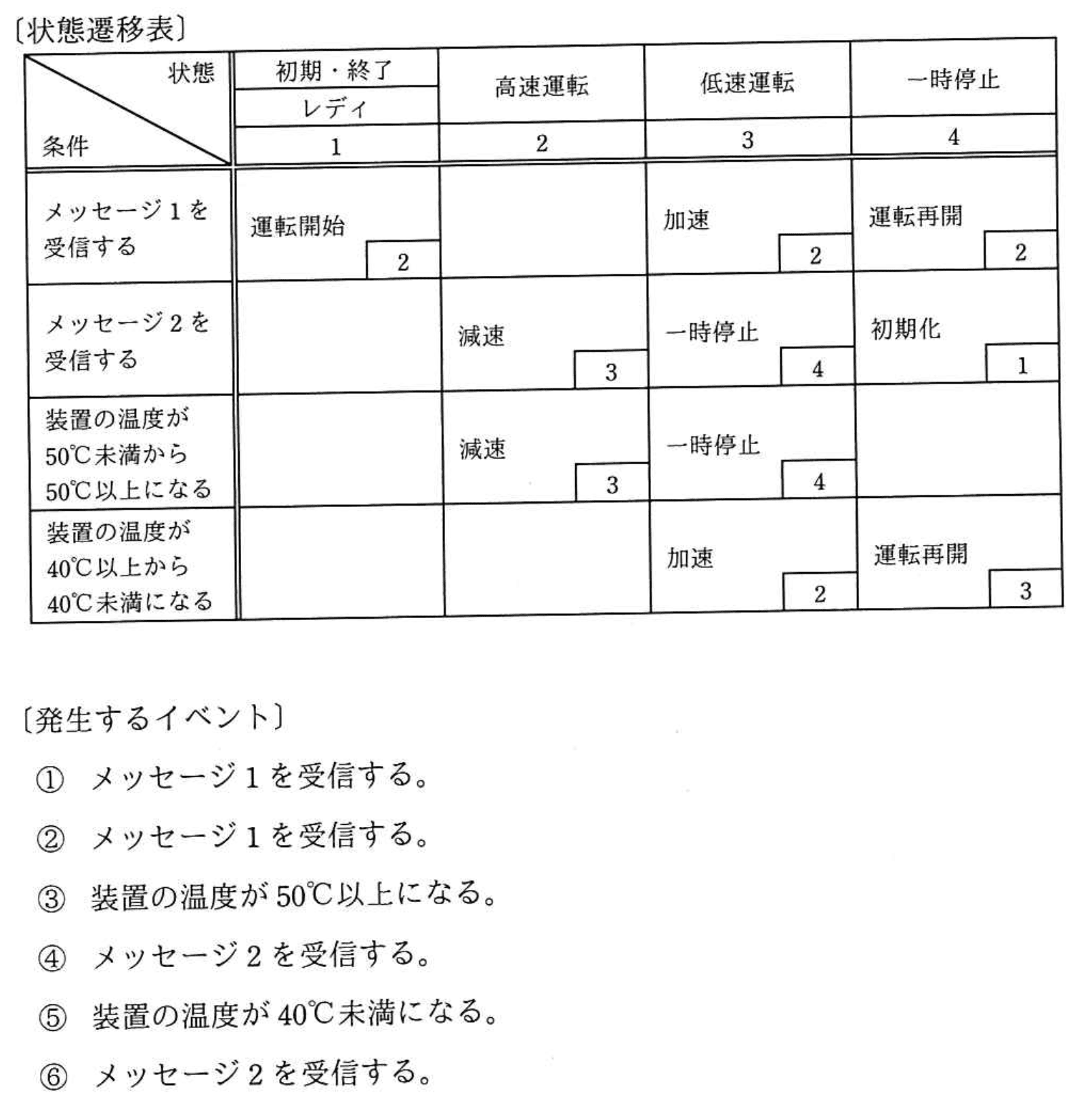状態遷移表のとおりに動作し、運転状況に応じて装置の温度が上下するシステムがある【午前2 解説】