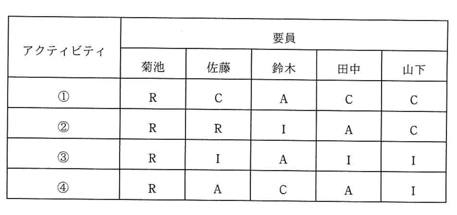 - エ:アクティビティ④の田中の「A」を「R」に変更すると、説明責任者が1人、実行責任者が2人となり条件を満たす。