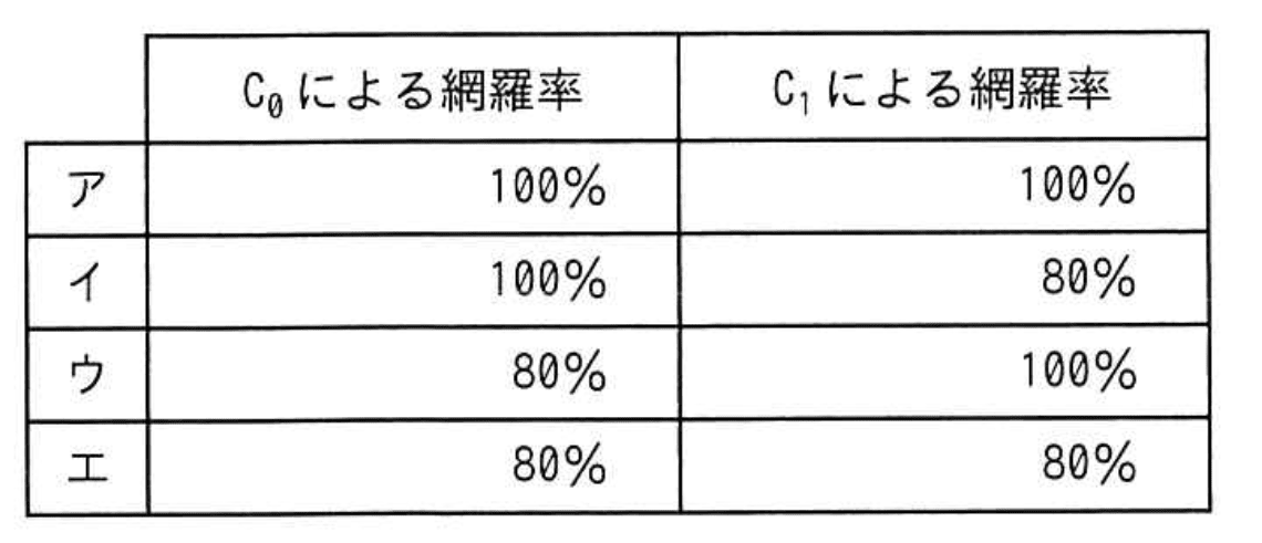 イの「による網羅率=100%、による網羅率=80%」が正解です。