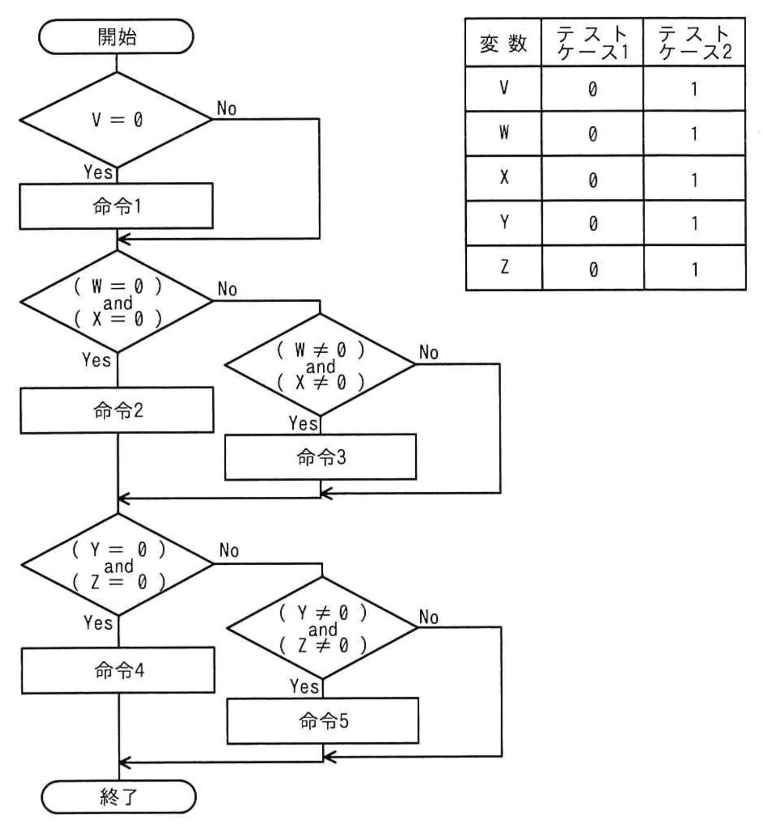 流れ図で示したモジュールを表の二つのテストケースを用いてテストしたとき、テストカバレッジ指標である(命令網羅)と(分岐網羅)とによる網羅率の適切な組みはどれか。ここで、変数V〜変数Zの値は、途中の命令で変更されない。