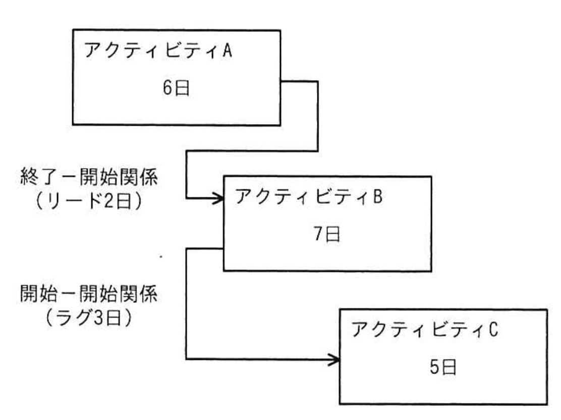 - 根拠:アクティビティA(6日)からB(7日)へはリード2日、BからC(5日)へはラグ3日の依存関係があるため、合計日数を正確に計算する必要がある。