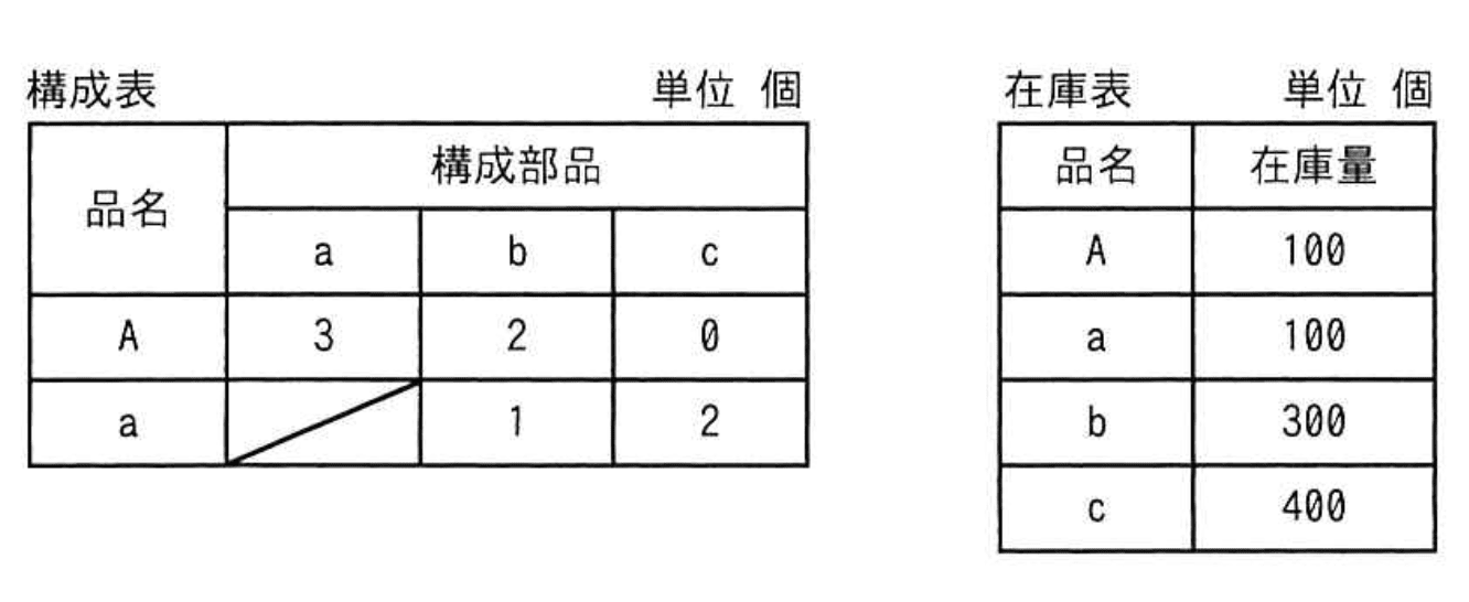 構成表の製品Aを300個出荷しようとするとき、部品bの正味所要量は何個か。ここで,A, a, b, cの在庫量は在庫表のとおりとする。また、他の仕掛残、注文残、引当残などはないものとする。