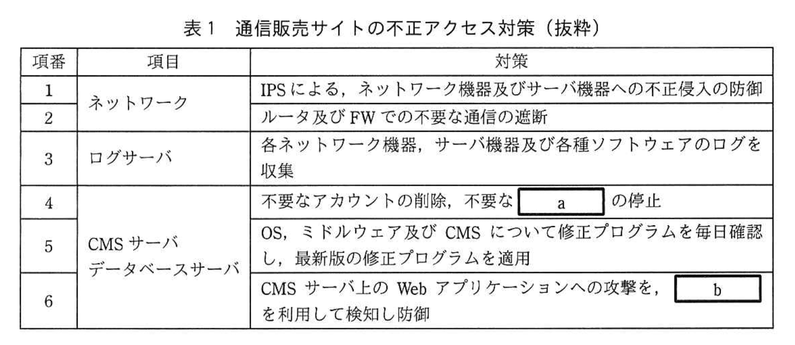 通信販売サイトはR社のデータセンタに設置されたルータ、レイヤ2スイッチ、ファイアウォール(以下、FWという)、IPS (Intrusion Prevention System) などのネットワーク機器とCMSサーバ、データベースサーバ、NTPサーバ、ログサーバなどのサーバ機器と各種ソフトウェアで構成されている。通信販売サイトは、会員情報などの個人情報を扱うので、様々なセキュリティ対策を実施している。R社が通信販売サイトで実施している不正アクセス対策(抜粋)を表1に示す。