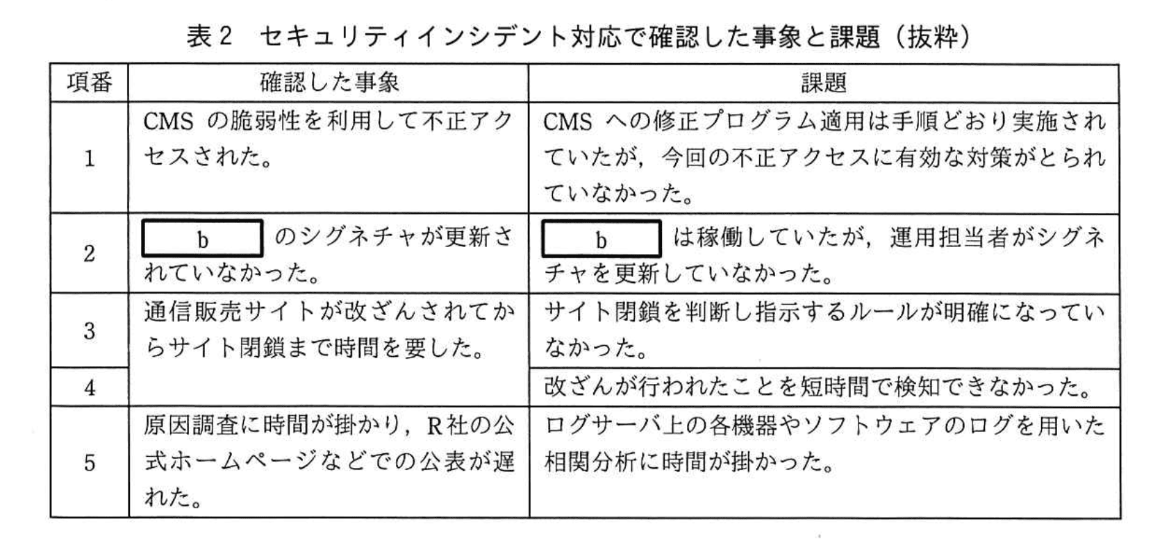 - 表2 項番2 に「b のシグネチャが更新されていなかった。」とあるように、b はシグネチャ更新型の対策製品であることが示唆されています。WAF も IPS と同様にシグネチャを用いて攻撃パターンを識別するため、条件に合致します。