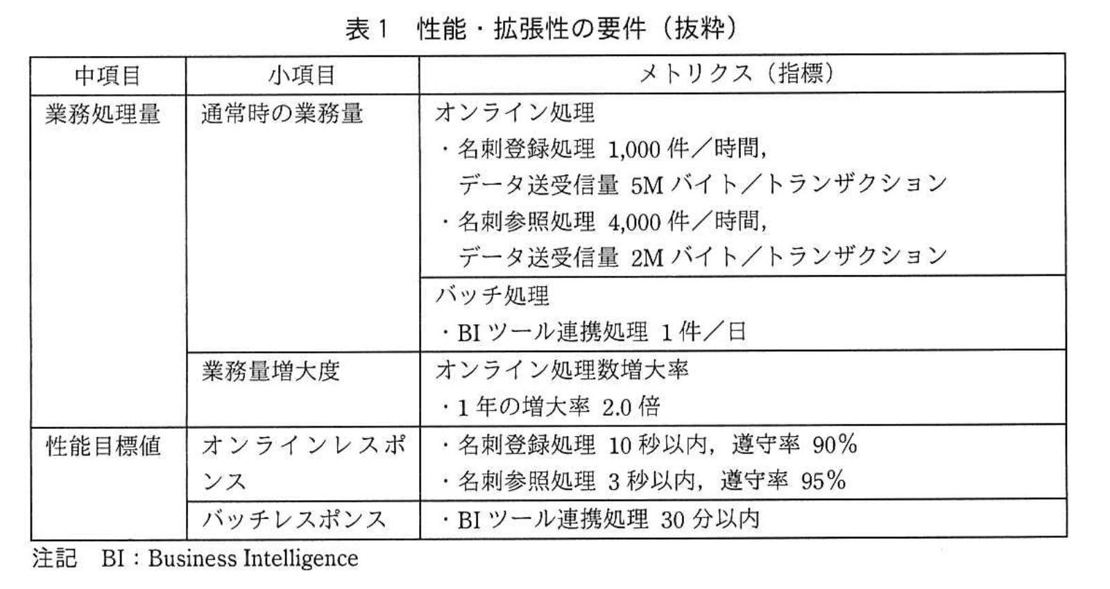 - 一方、非機能要件(表1)ではバッチ処理の性能目標値として「BIツール連携処理 30分以内」と記載されています。