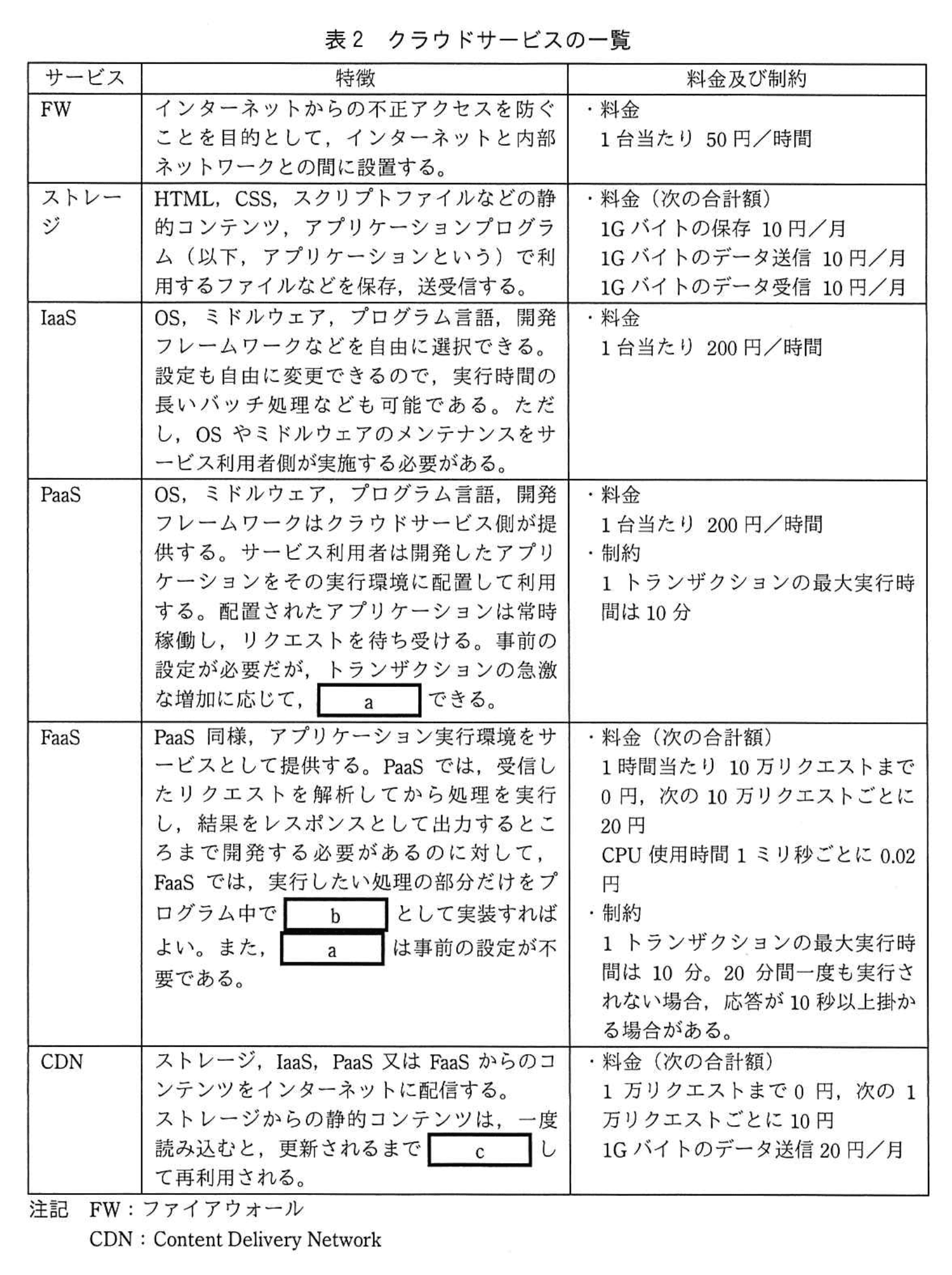 h に該当するサービスは、表2の FaaS の説明中の
