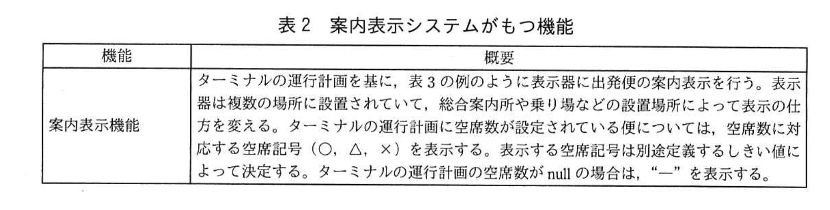 運行管理システムがもつ案内表示に関連する機能を表1に、案内表示システムがもつ機能を表2に、表示器の表示項目の例を表3に示す。