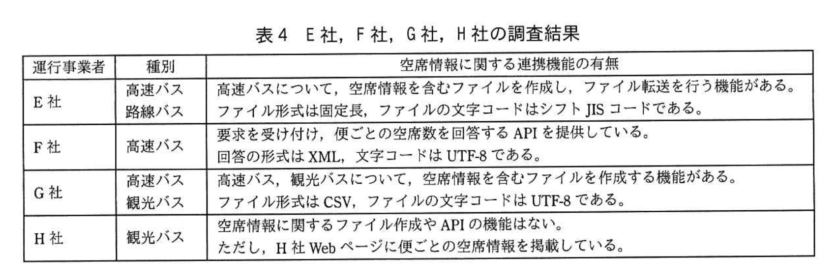 運行事業者データ連携機能の空席情報を取得する処理について、運行事業者が空席情報を含むデータの連携機能をもつ場合には、それを活用する方針とした。そこで、D社は、高速バス、観光バスの運行事業者である E社、F社、G社、H社について、運行している全てのバスの種別と連携機能の有無を調査した。調査結果を表4に示す。