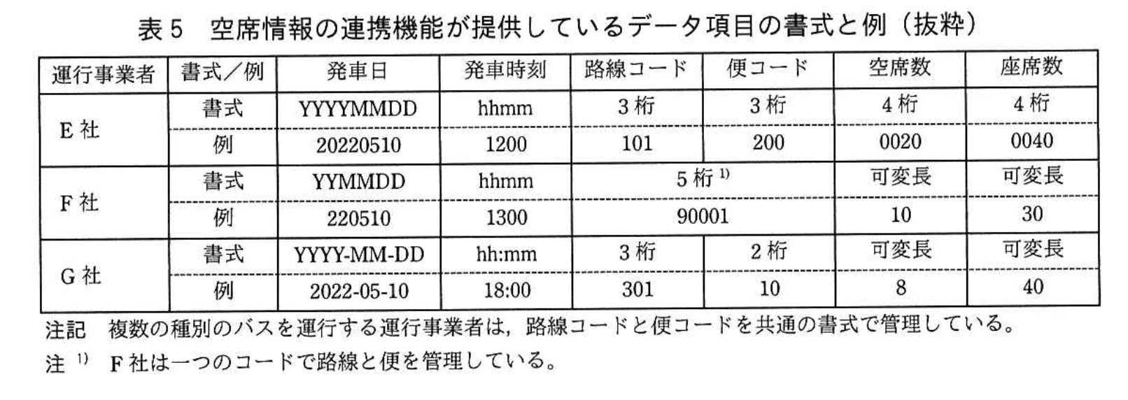 - 表5に登場する運行事業者は【問題文】の「表5 空席情報の連携機能が提供しているデータ項目の書式と例」に列挙されている「E社」「F社」「G社」の3社だけです。