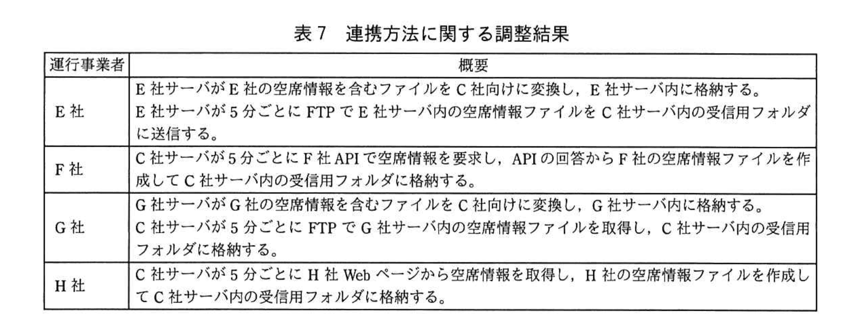 D君は、連携方法について、それぞれの運行事業者を調整を行った。H社については運行する便数が少ないこともあり、開発費用が比較的安価である③Webページから情報を抽出する方法を用いることにした。連携方法に関する調整結果を表7に示す。