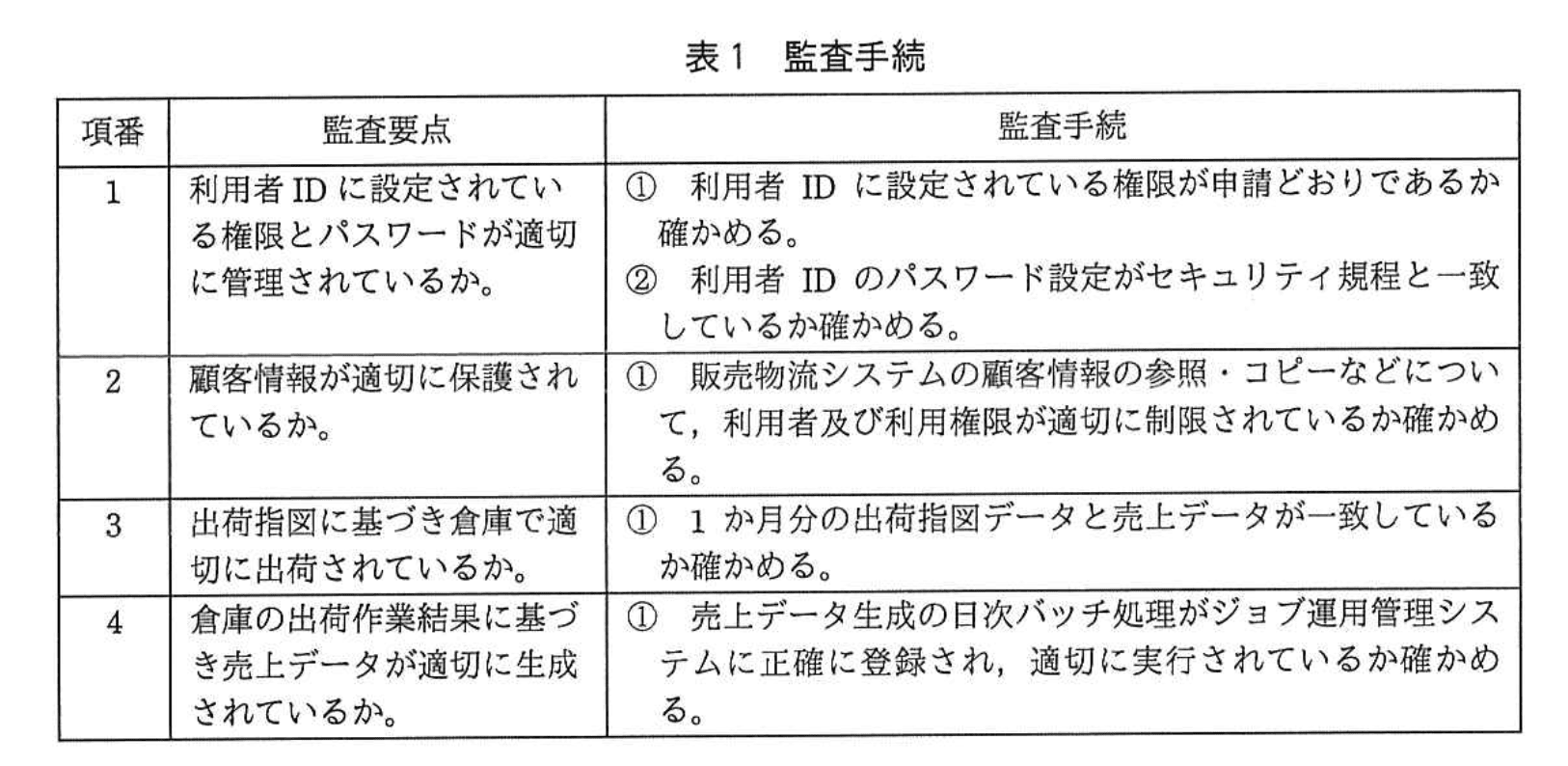 システム監査担当者は、予備調査に基づき、表1のとおり監査手続きを策定した。