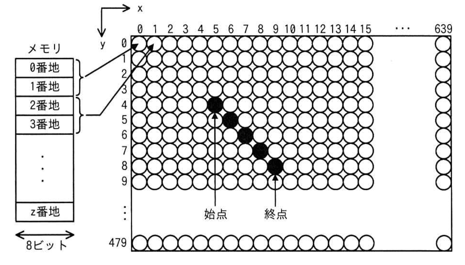 したがって、問題文の「始点(54)から終点(98)まで直線を描画」とは、メモリ番地54~98の範囲の画素に線を引くことを意味し、x=7の画素はy=1行目にあると推測します。