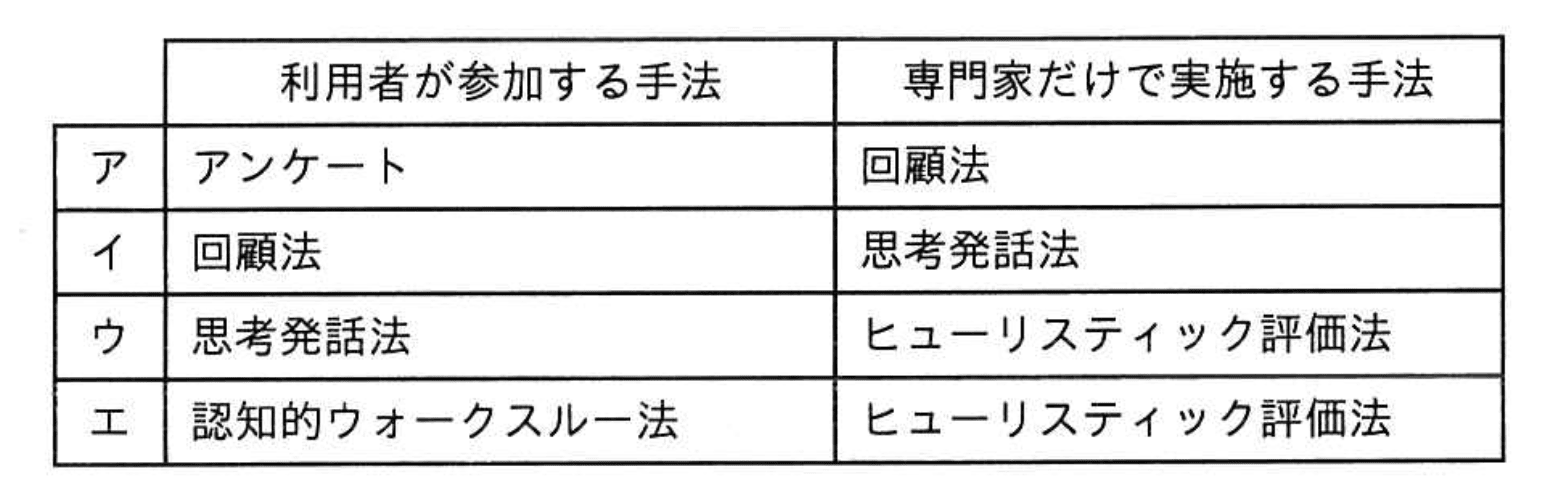 - ウ:思考発話法は利用者参加型、ヒューリスティック評価法は専門家評価型で正しい組み合わせ。