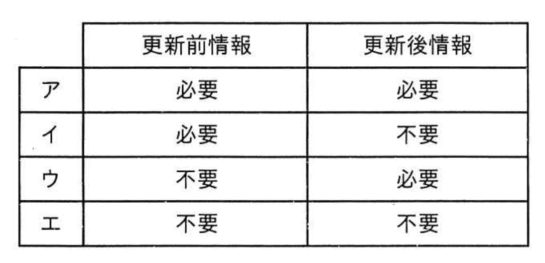 - エ(更新前情報不要、更新後情報不要):両方欠落し、障害回復が不可能で誤り。