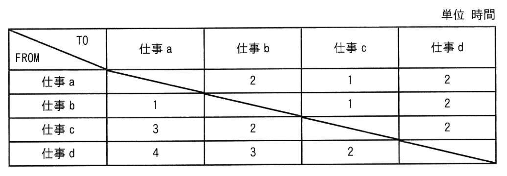 製造業のA社では、NC工作機械を用いて、四つの仕事 a〜d を行っている。各仕事間の段取り時間は表のとおりである。合計の段取り時間が最小になるように仕事を行った場合の合計段取り時間は何時間か。ここで、仕事はどの順序で行ってもよく、a〜dを一度ずつ行うものとし、FROM からTOへの段取り時間で検討する。