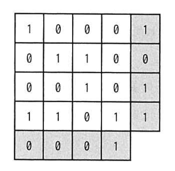 - 各行と各列にパリティビットを付加し、計5列×5行のマトリクスを作成する。