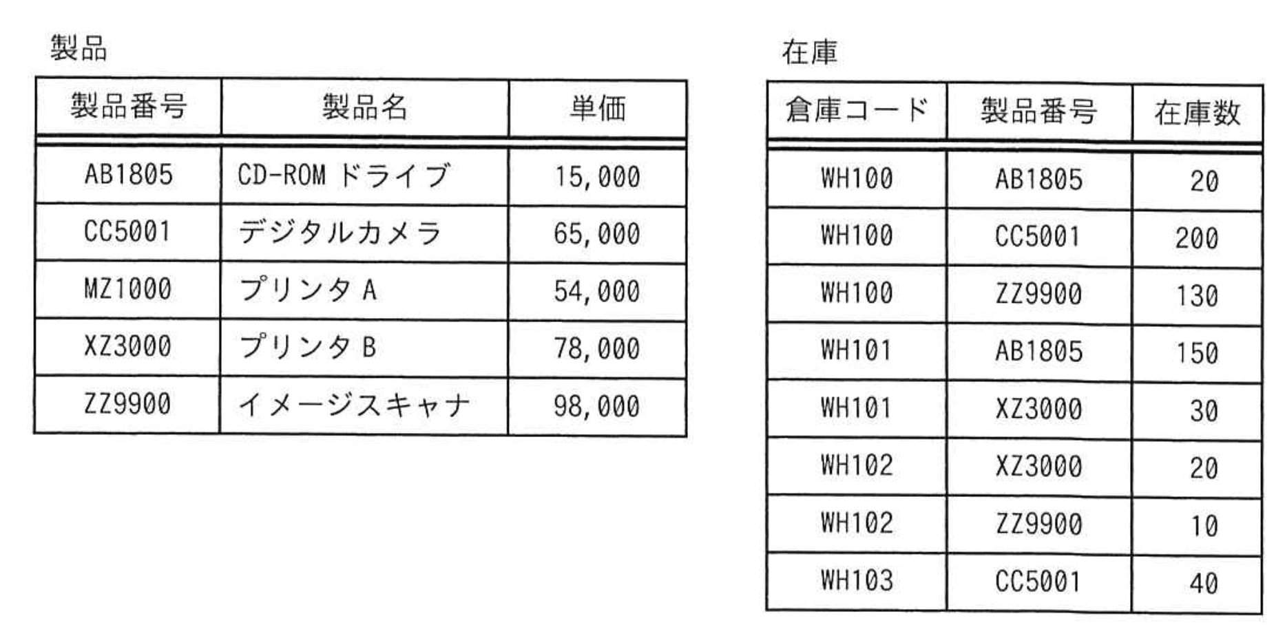 “製品” 表と “在庫” 表に対し、次の SQL文を実行した結果として得られる表の行数は幾つか。