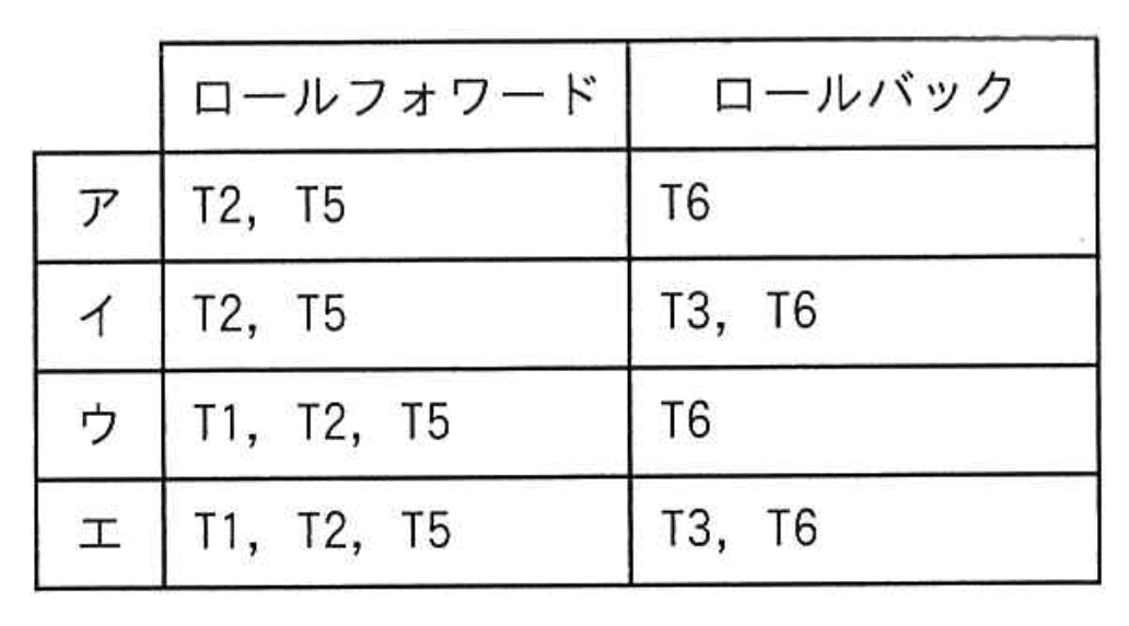 DBMS をシステム障害発生後に再立上げするとき、ロールフォワードすべきトランザクションとロールバックすべきトランザクションの組合せとして、適切なものはどれか。ここで、トランザクションの中で実行される処理内容は次のとおりとする。