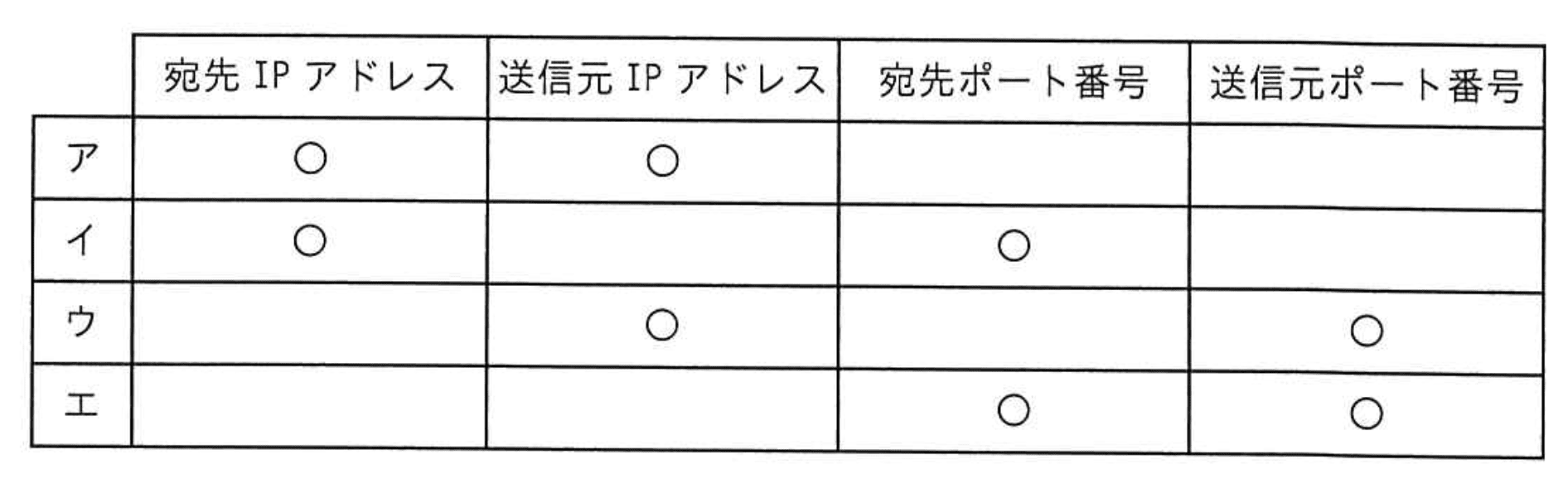 - 表の中で「宛先IPアドレス」と「宛先ポート番号」に○がある選択肢を選ぶ。