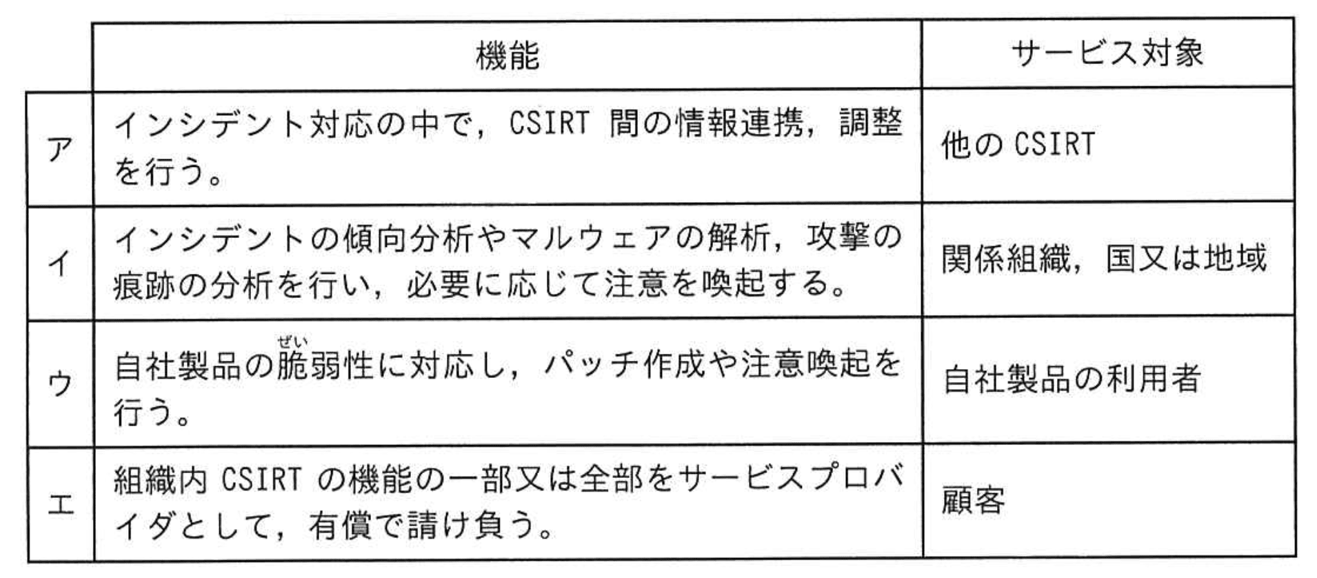 - ウ:自社製品の脆弱性対応はベンダーCSIRTの機能であり、コーディネーションセンターの役割ではありません。
