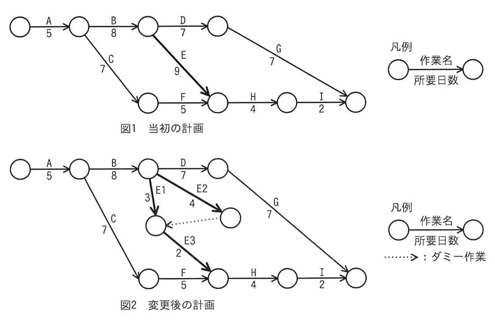 作業Eは当初9日かかっていましたが、分割後はE1(3日)+E3(2日)=5日、E2(4日)は別経路で、ダミー作業で依存関係を調整しています。