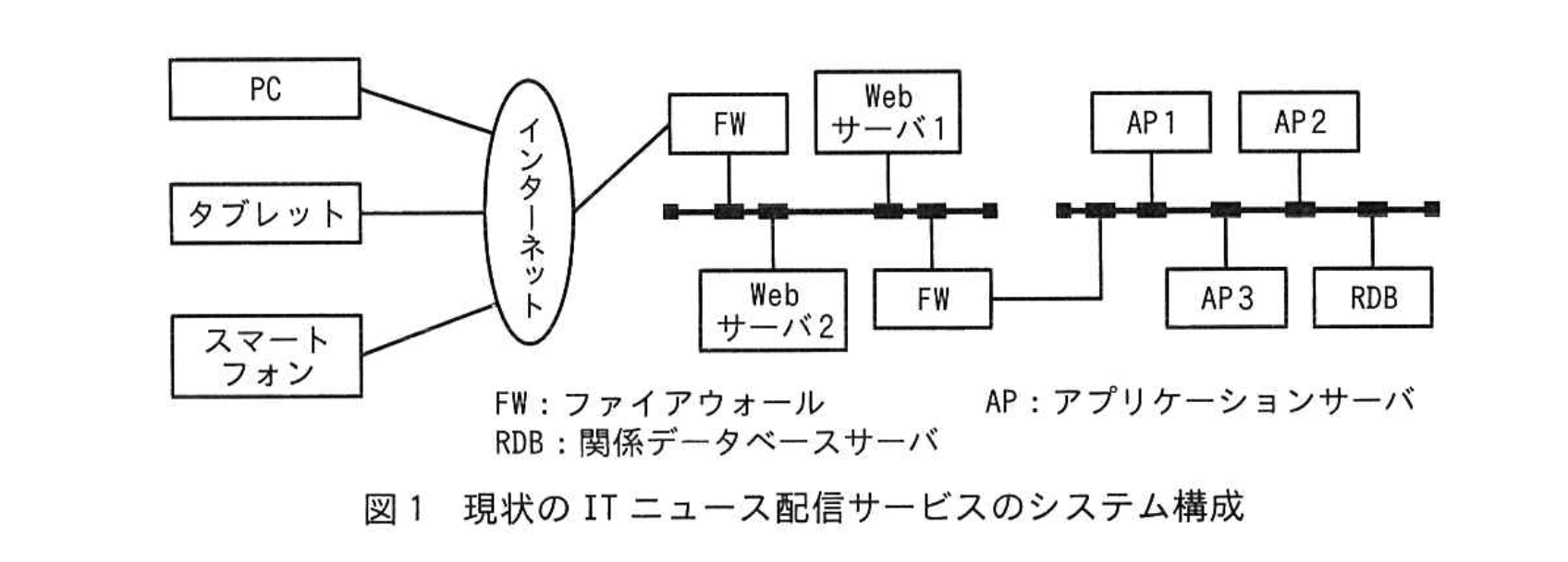 ITニュース配信サービスでは、多くの利用者にサービスを提供するために、複数台のサーバでシステムを構成している。配信される記事には、それぞれ固有の記事番号が割り振られている。現状のシステム構成を図1に、ニュースを表示する画面一覧を表1に示す。