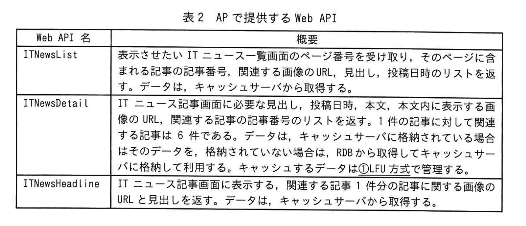 - 【問題文】表2の “ITNewsDetail” には「キャッシュするデータは①LFU方式で管理する。」とあります。