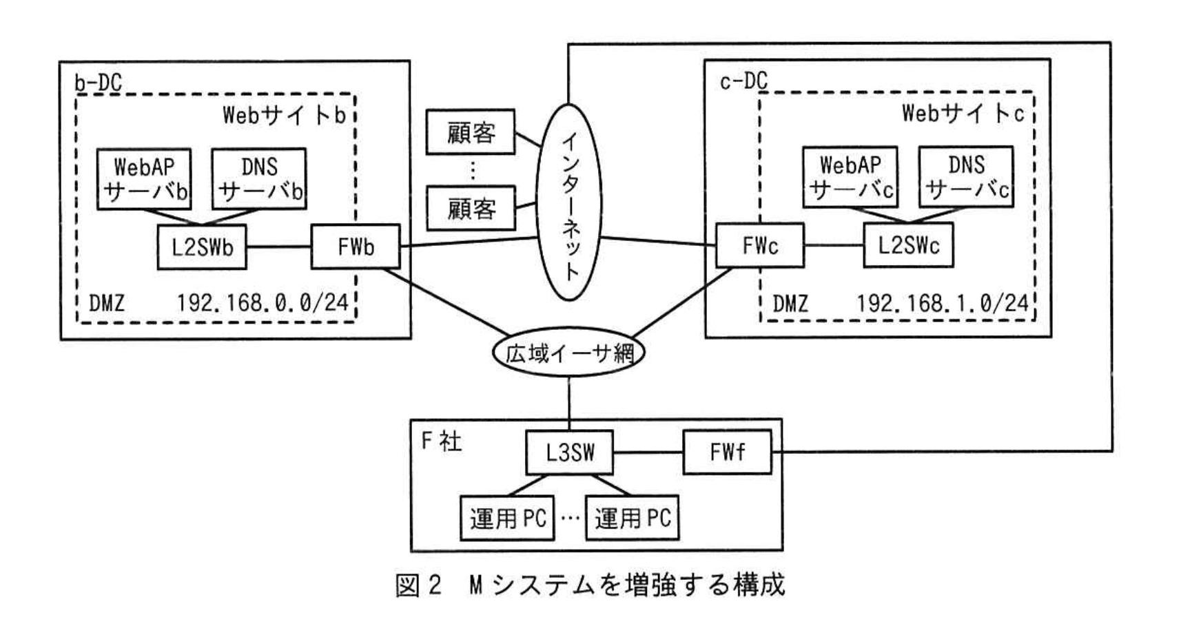と明記されています。 - 「広域イーサ網経由」は F 社と b-DC を結ぶ閉域網であり、インターネット側の NAT(“DMZ に設定されたプライベートアドレスとインターネット向けのグローバルアドレスを 1 対 1 で静的に変換する”)を通りません。したがって利用されるのは DMZ 内のプライベートアドレスに紐づく社内向けドメインです。
