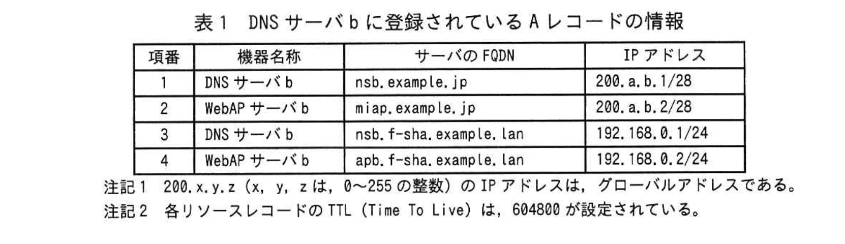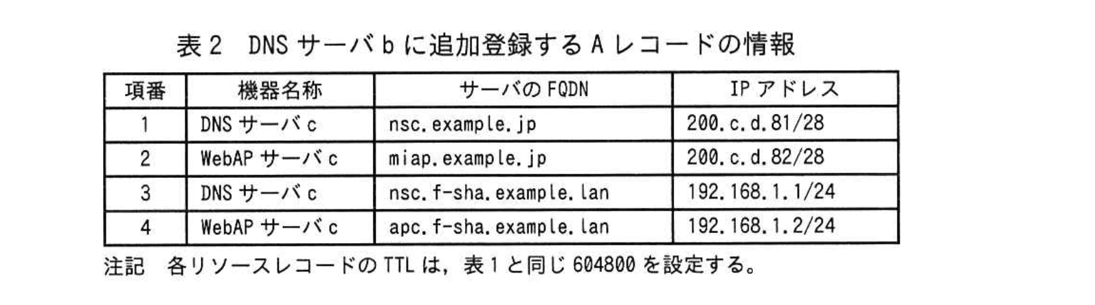 DNSサーバbに追加登録するAレコードの情報を表2に示す。