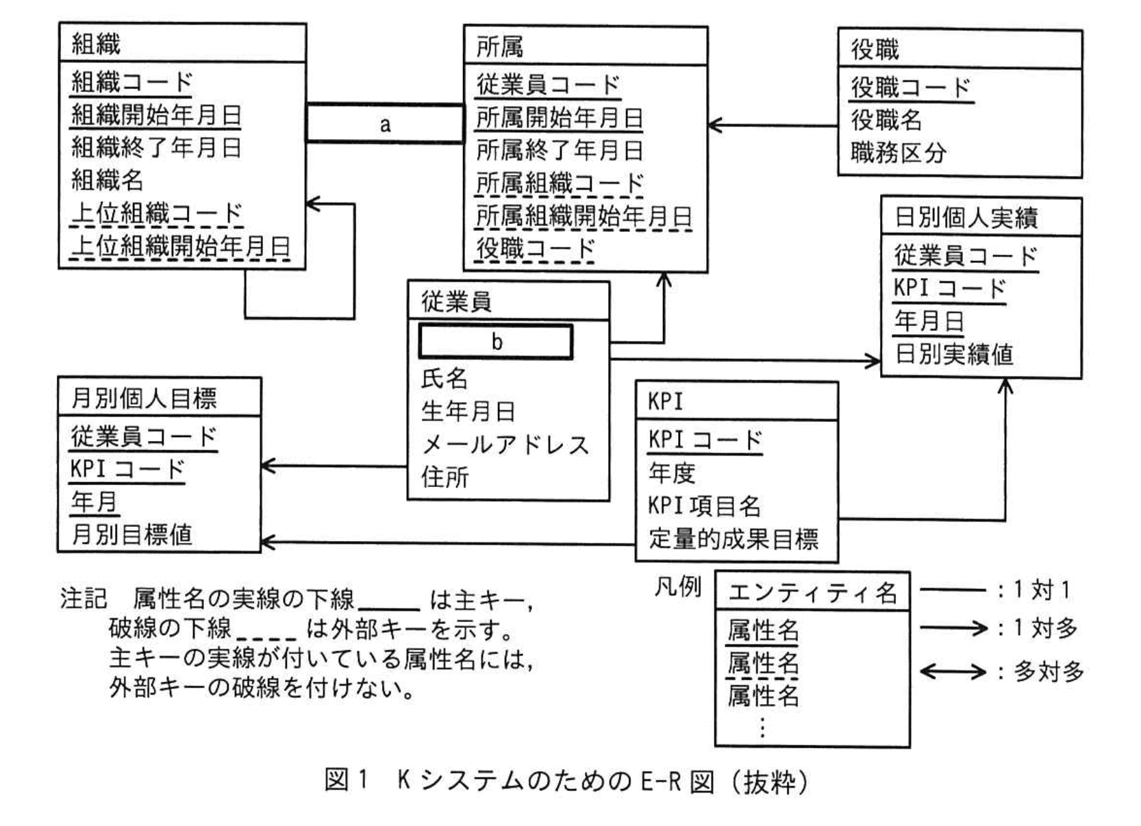 作成したE-R図(抜粋)を図1に示す。Kシステムでは、このE-R図のエンティティ名を表名にし、属性名を列名にして、適切なデータ型で表定義した関係データベースによってデータを管理する。