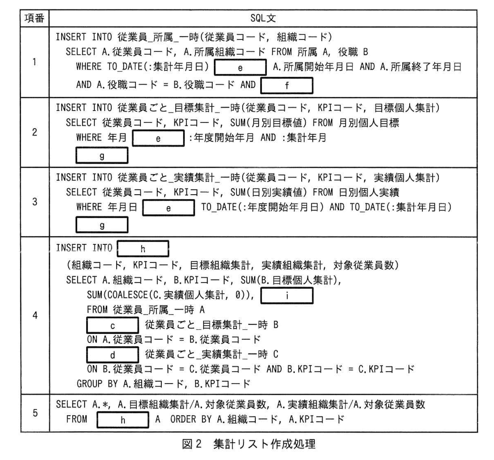 集計リスト作成処理のSQL文を図2に示す。ここで、TO_DATE関数は、指定された年月日をDATE型に変換するユーザー定義関数である。関数COALESCE(A,B)は、AがNULLでないときはAを、AがNULLのときはBを返す。また、“:年度開始年月月”、“:集計年月日”、“:集計年月月”は、該当の値を格納する埋込変数である。