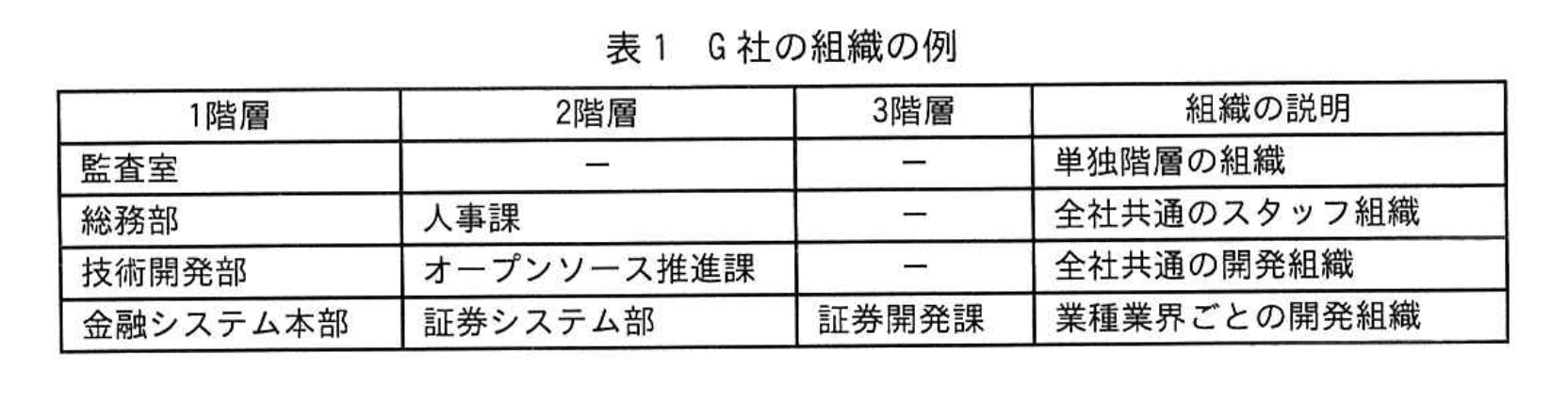 G社の組織は、表1の例に示すように最大三つの階層から構成されている。