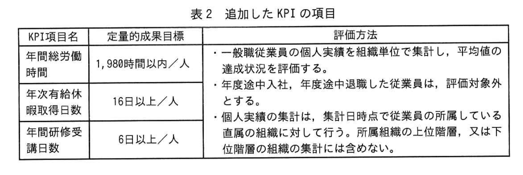 G社では、仕事にメリハリを付け、仕事の質を向上させることが、G社の業績向上につながるものと考え、従来のKPIに加え、働き方改革、従業員満足度向上に関するKPIの項目を今年度から追加することにした。追加したKPIの項目を表2に示す。
