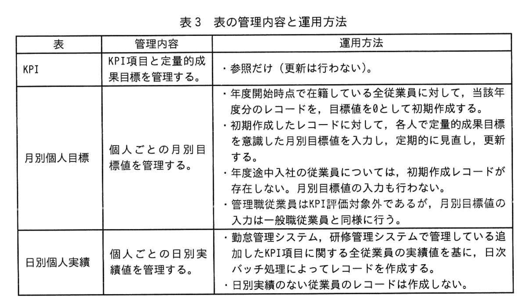 追加した三つのエンティティを基に新規に作成された表の管理内容と運用方法を表3に示す。