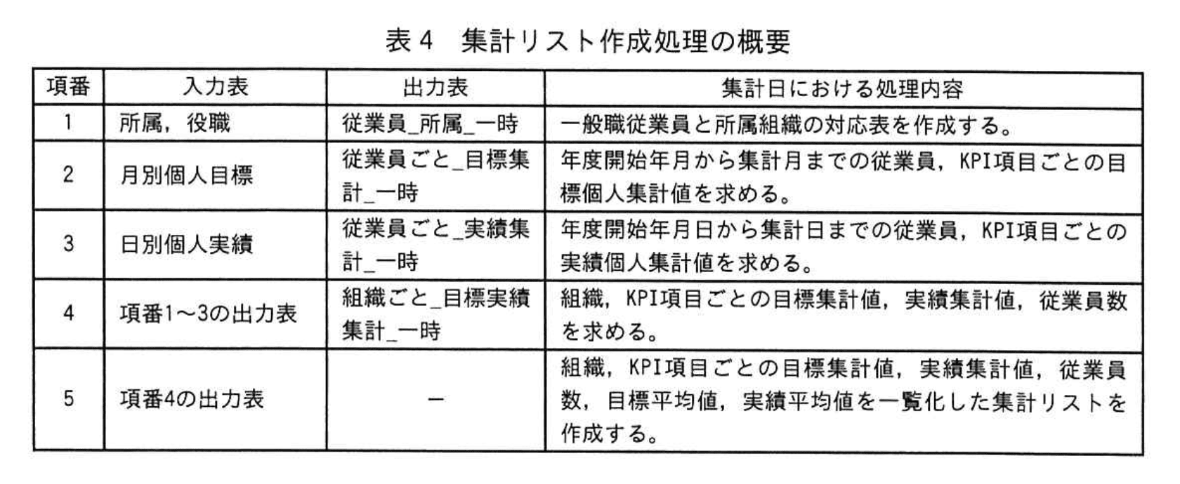 集計リスト作成処理の概要を表4に示す。