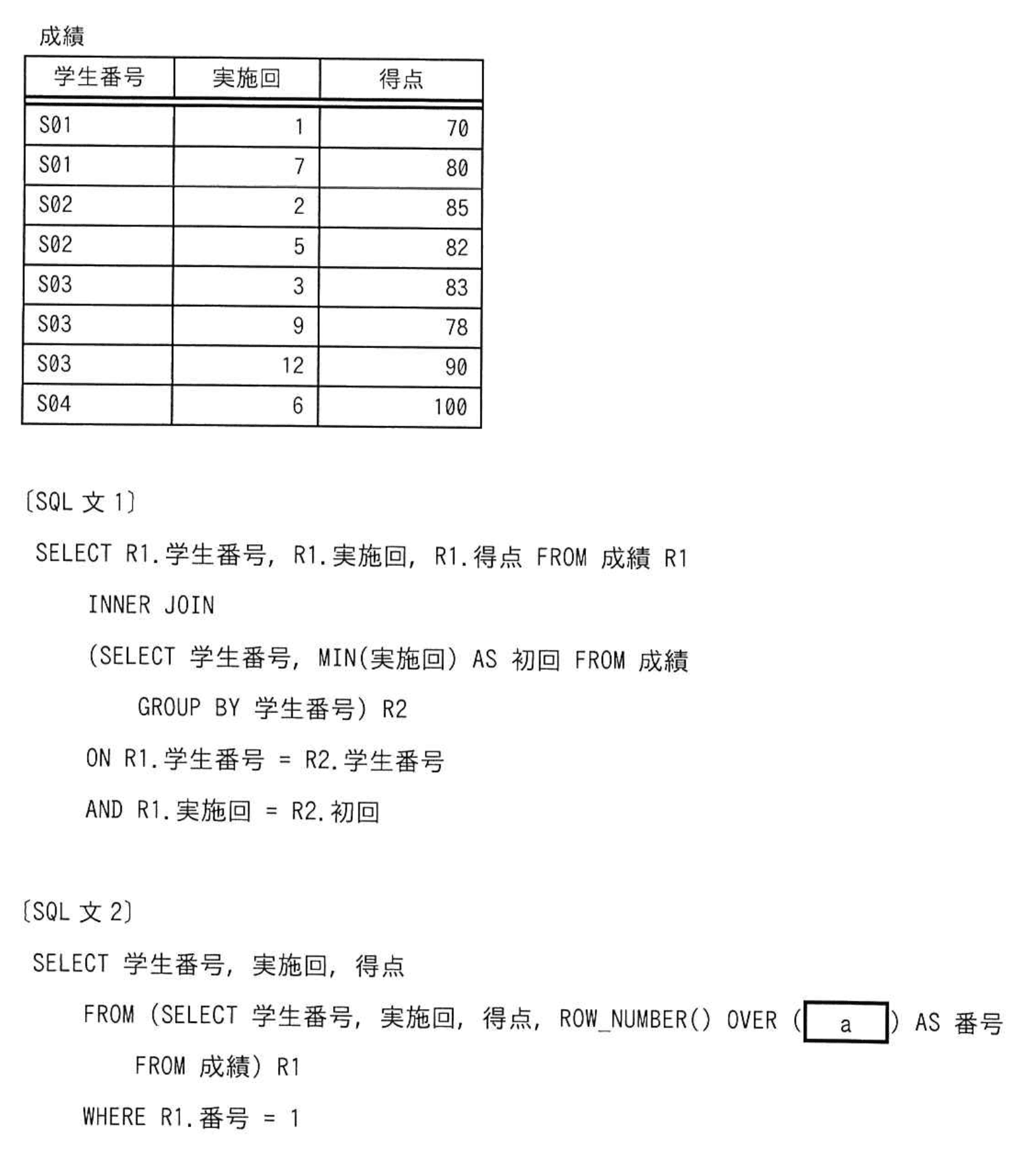 “成績”表に対して、SQL文1と同一の結果を得るために、SQL文2のaに入れる字句はどれか。