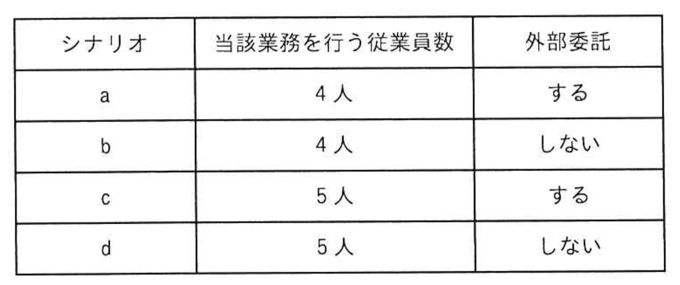 - エ(シナリオd):外部委託せず従業員5人で業務を行うため、人件費削減も付加価値利益も少ない。