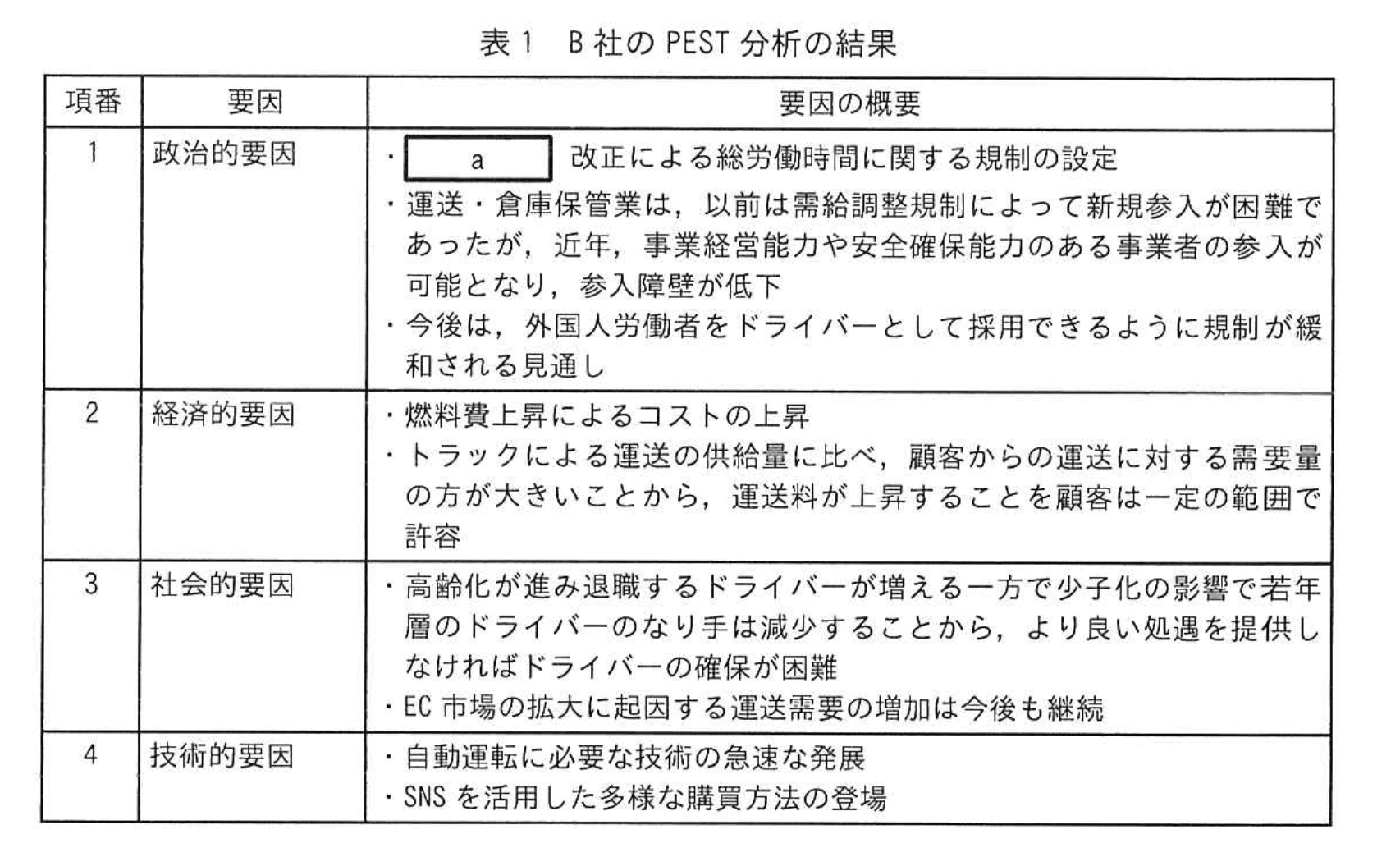 E課長は、①PEST分析、ファイブフォース分析の順に分析し、その結果について検討した。PEST分析の結果から、a が改定されたことによって、ドライバーを含む労働力の総量が減少することが懸念され、また、社会的要因によってドライバーのなり手が減ることを認識した。このことはファイブフォース分析の結果における売手の交渉力の脅威にも大きな影響を及ぼすことに気が付き、ドライバーの需要に対して供給が減ることから、d と考えた。