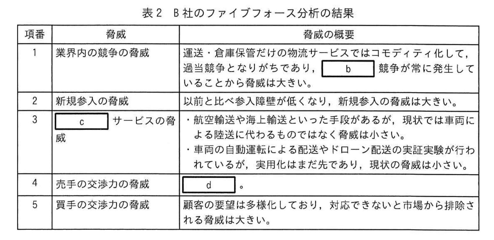 次に、E課長は、ファイブフォース分析を進めることにした。ファイブフォース分析の結果、B社が受ける脅威の概要を表2のように整理した。