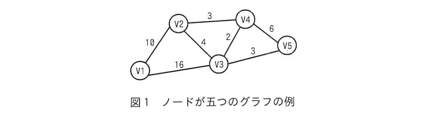 図1にノードが五つのグラフの例を示す。図1の例では、始点を V1 のノードとし、終点を V5 のノードとした場合の最短経路は、V1, V2, V3, V5 のノードを順にたどる経路である。