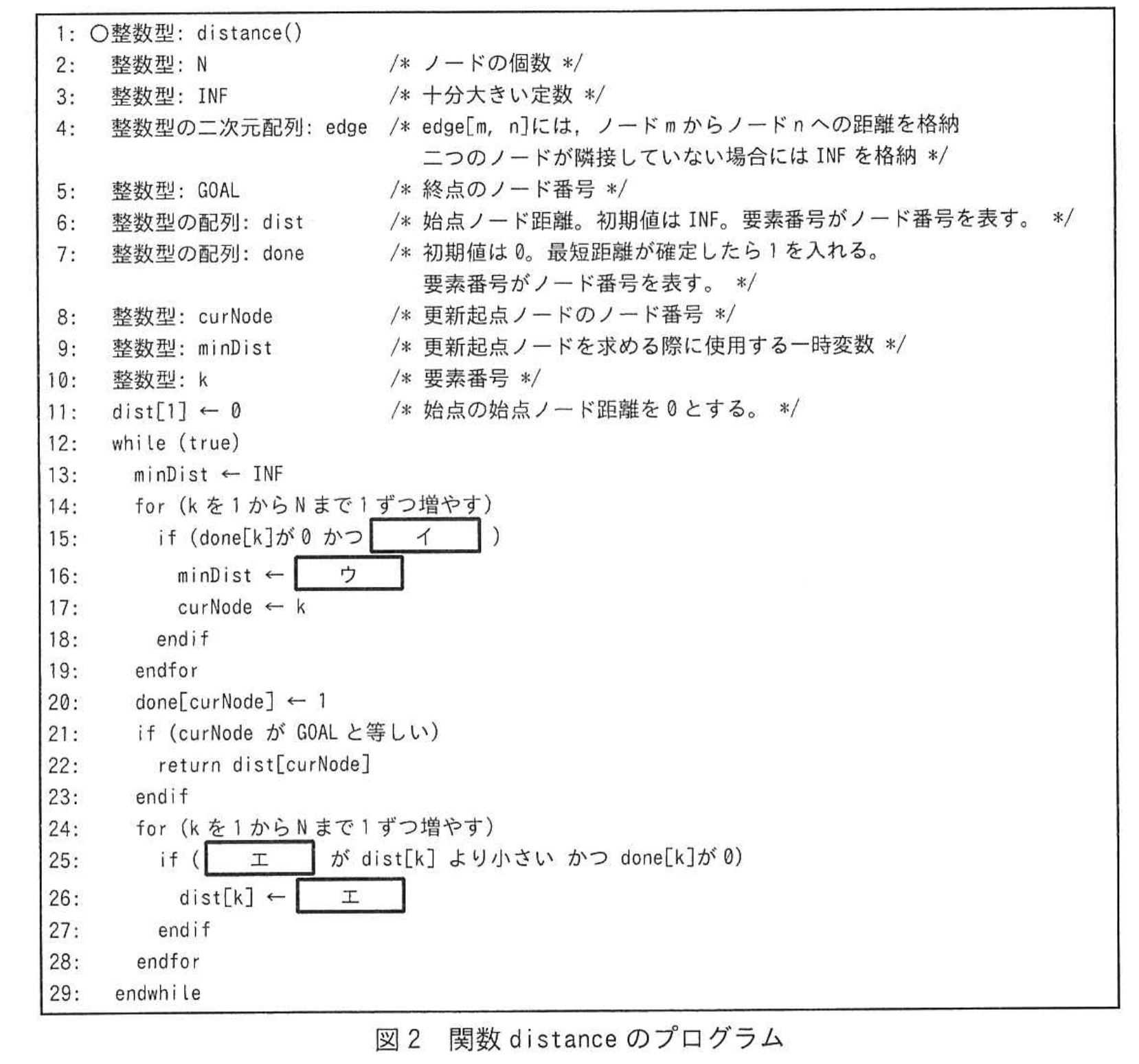 です。ここで採用した経路の“直前に経由したノード”は、現在の更新起点ノード curNode なのでviaNode[k] ← curNodeが唯一の適切な代入文となります。 -