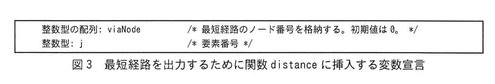 関数 distance を変更して、求めた最短距離となる最短経路を出力できるようにする。具体的には、まず、ノード番号1〜nを格納する配列 viaNode を使用するために、図3の変数宣言を図2の行10の直後に、図4のプログラムを図2の行21の直後に、それぞれ挿入する。さらに、各ノードの始点ノード距離を更新するたびに、直前に経由したノード番号を viaNode に格納する①代入文を一つ、図2のプログラムの行オの直後に挿入する。