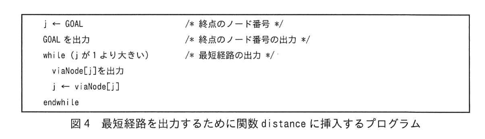 図4のコードはj ← GOAL GOAL を出力 while (j が 1 より大きい) viaNode[j] を出力 j ← viaNode[j] endwhileとなっており、終点 GOAL から始めて viaNode[j] を取り出し、そのノード番号を次の探索対象 j に設定しています。これは「viaNode に格納してあるノード番号をたどる」ことで最短経路を後ろから前へ順次たどる処理です。 -