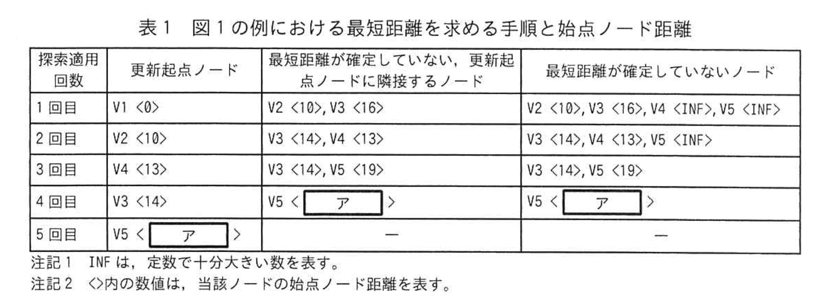 図1の例において、始点V1から終点V5までの経路に対して、上の①〜③を繰り返し適用する。そのとき、更新起点ノードを選ぶたびに、更新起点ノードの始点ノード距離、更新起点ノードと隣接するノードの始点ノード距離、及び最短距離が確定していないノードの始点ノード距離を計算した内容を表1に示す。