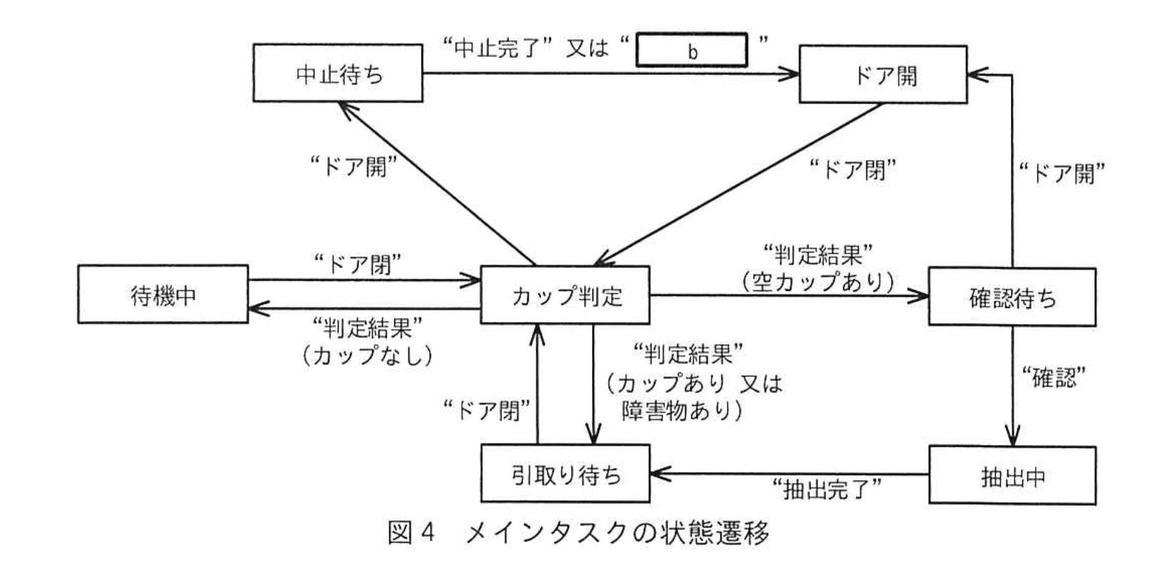 - メインタスクは“中止”を発行したあと、図4で「カップ判定 → 中止待ち “ドア開”」という遷移を行い、結果が返るまで待機します。