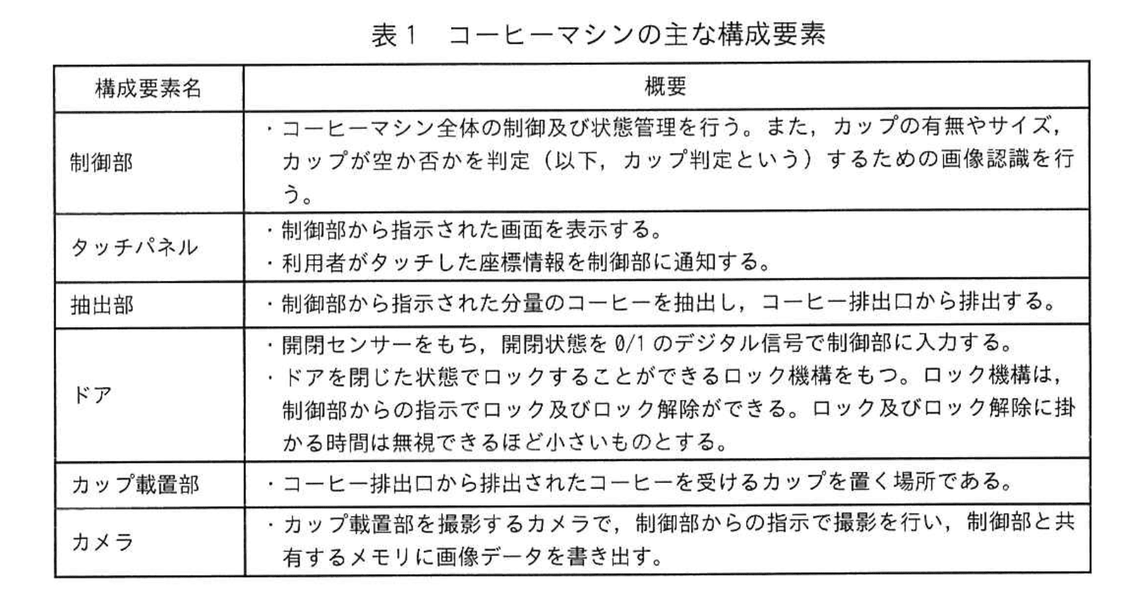引用:「コーヒーの排出が終わると、ドアをロック解除し、タッチパネルにカップの引取を促す画面を表示する。」